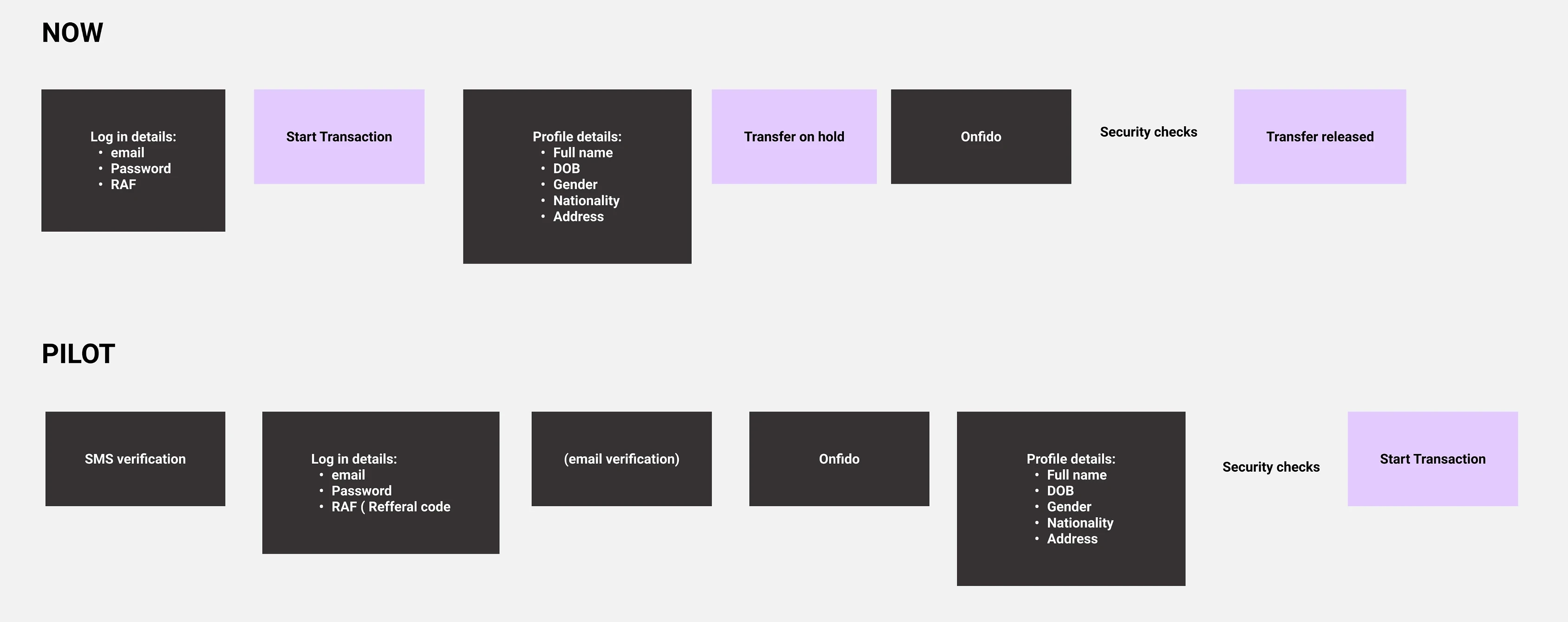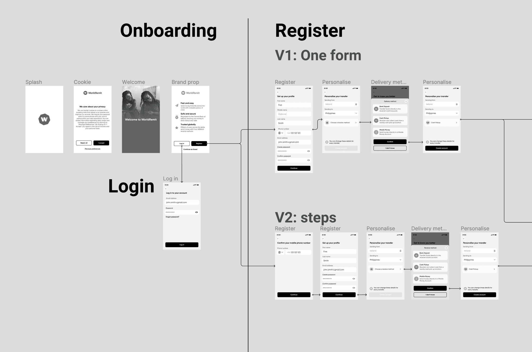 I began by redesigning the onboarding experience. Along with UX designers, I created low-fidelity designs that tackles the drop-off issue caused by existing compliance and tech. We played with two versions: